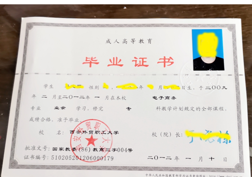 西安外贸职工大学成人教育毕业证样板/模板,由教育部统一印制,实物有多处防伪标识。
