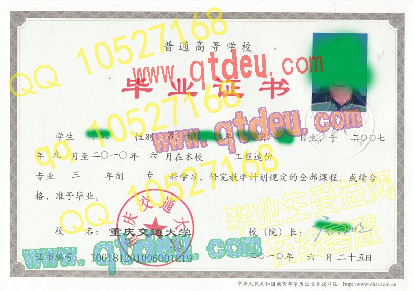 重庆交通大学 -2010年毕业证样本,是由教育部统一印制的毕业证,实物有多处防伪标识。