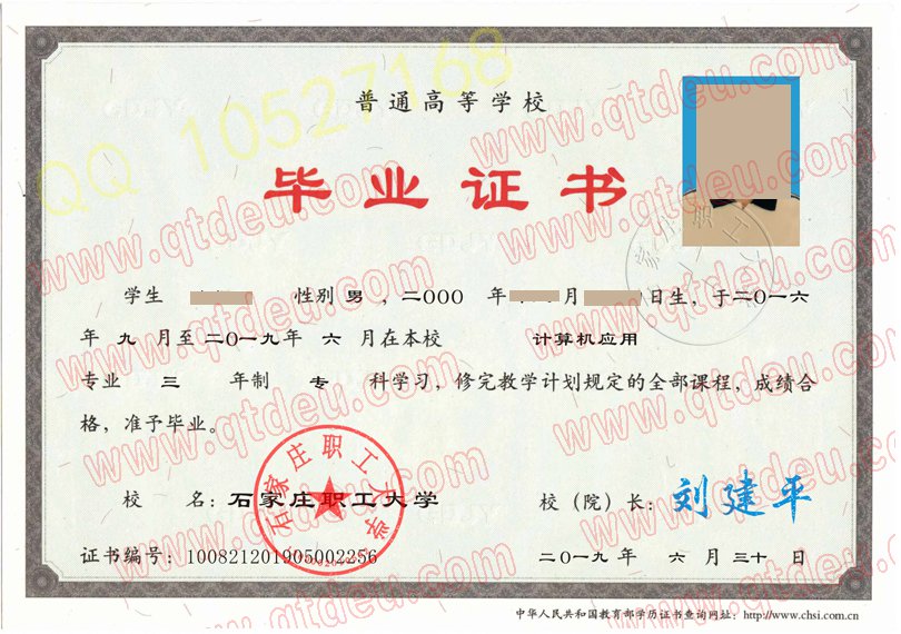 石家庄职工大学|毕业证|样本图片,由教育部统一印制,实物有多处防伪标识。