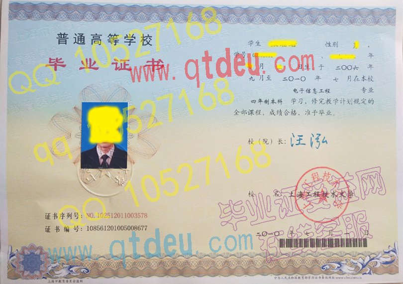 上海工程技术大学2010年毕业证模板{样本},由上海市教育委员会统一印制,毕业证书为上海独有专版,实物有多处防伪标识。