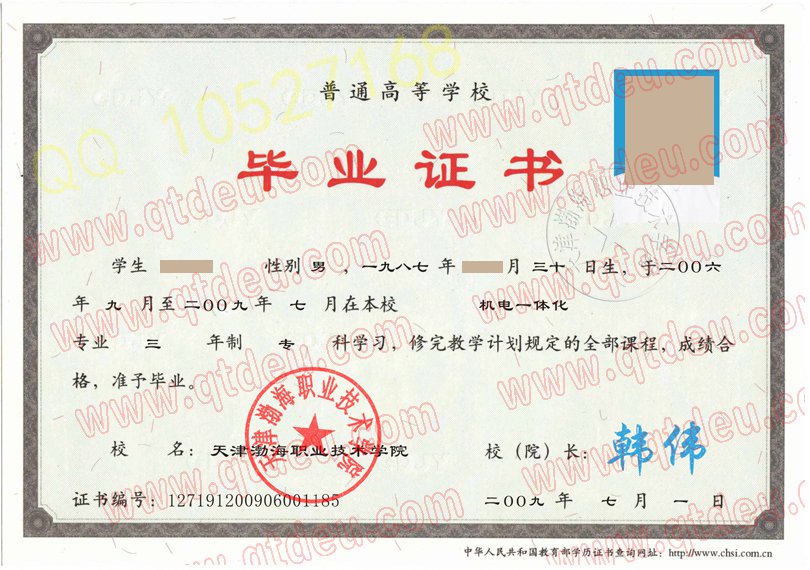 天津渤海职业技术学院毕业证模板{样本} ,由教育部统一印制,实物有多处防伪标识。 该年份毕业证编号开头5位数字即学校代码:12719 任校(院)长: 韩伟 天津渤海职业技术学院2012年院长; 于兰平 现任天津渤海职业技术学院院长;